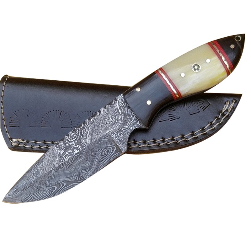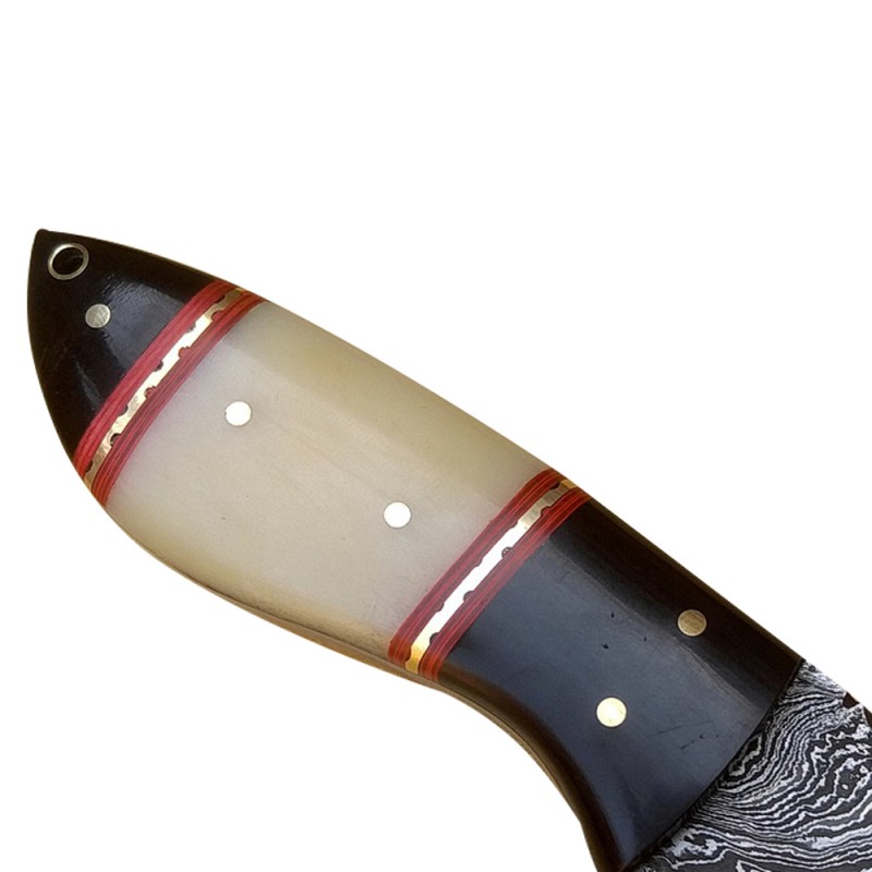 Handle Materials: Camel Bone & Buffalo Horn, Brass Pins, Lanyard Hole, Brass & Red Fiber Spacers, Mosaic Pin