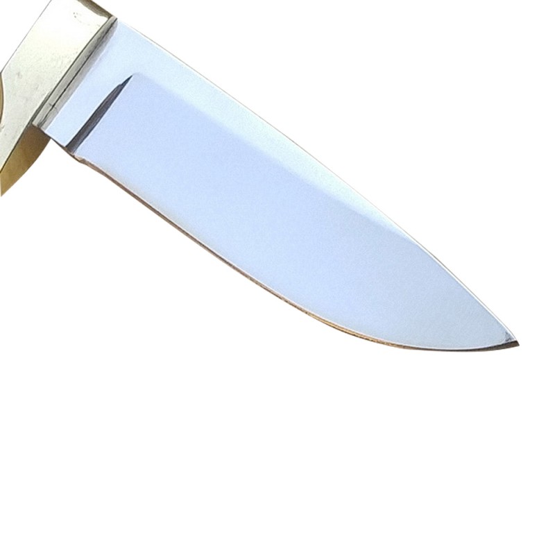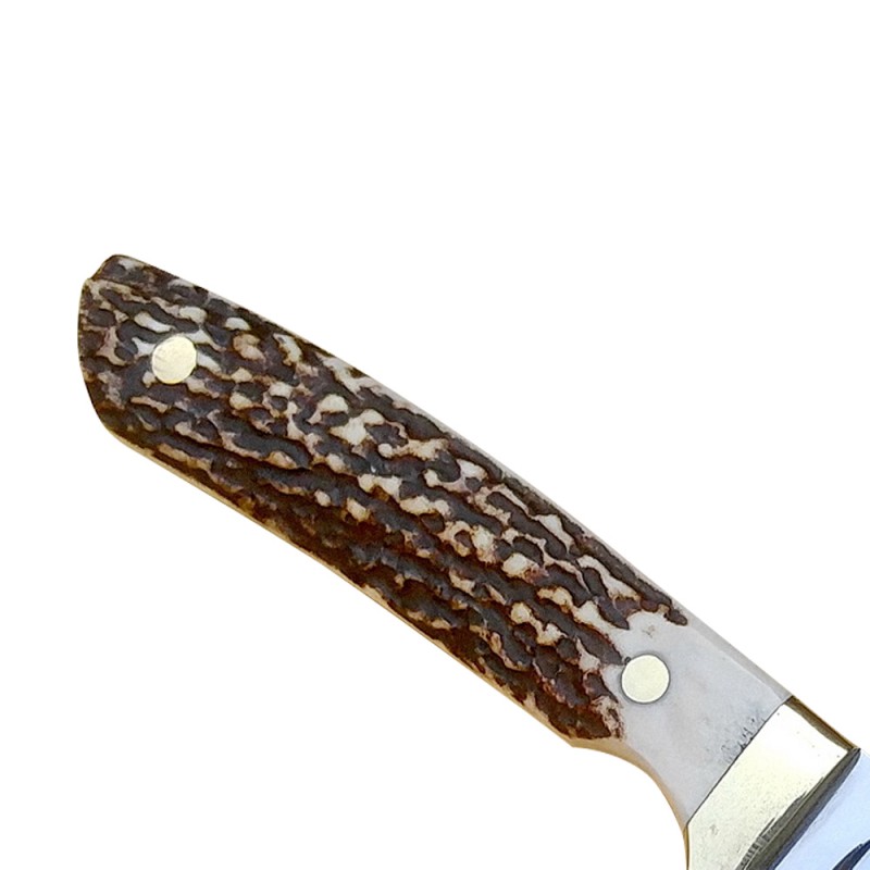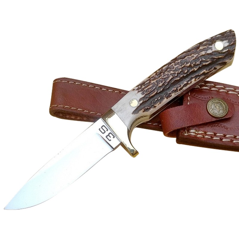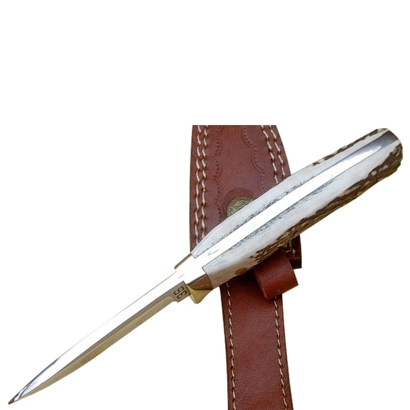 Total Length: 8 InchBlade Material: J2 Steel 420 Hardness: 58 HRC Rockwell ScaleHandle Materials: Stag Horn, Brass Guard, Steel PinsOther Features: Dull FinishHand Made Leather Sheath